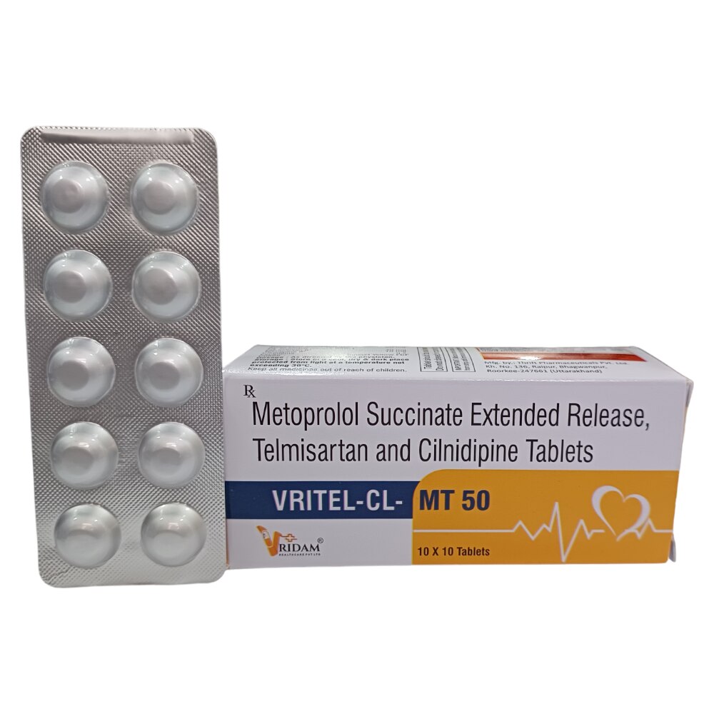 This triple-drug combination is used for comprehensive and sustained control of high blood pressure, especially in patients with moderate to severe hypertension who require multi-mechanism therapy. Telmisartan relaxes blood vessels by blocking angiotensin-II receptors, reducing vascular resistance. Cilnidipine (dual L-type and N-type calcium channel blocker) dilates blood vessels and suppresses sympathetic nerve activity, helping control BP without reflex tachycardia. Metoprolol Succinate ER (cardio selective beta-blocker) slows heart rate and reduces cardiac workload, providing 24-hour heart rate and BP control. Together, they offer round-the-clock BP stability, reduce strain on the heart, and help protect vital organs such as the brain and kidneys Indications : Moderate to severe hypertension Hypertension with increased heart rate Patients not adequately controlled on dual-drug therapy Hypertension with high cardiovascular risk Prevention of complications like stroke, heart attack, and heart failure Side Effects : Common Side Effects Dizziness or light-headedness Fatigue or weakness Headache Slow heart rate Less Common / Rare Low blood pressure (hypotension) Ankle or foot swelling Palpitations Cold hands or feet Nausea or abdominal discomfort Seek medical advice if fainting, severe dizziness, breathing difficulty, or persistent swelling occurs. Dosage : One tablet once daily, or as prescribed by the physician Preferably taken at the same time each day Can be taken with or without food Swallow whole; do not crush or chew (due to ER formulation) Dose adjustment depends on BP response, heart rate, and patient condition. Precautions : Not recommended in patients with severe bradycardia, heart block, or cardiogenic shock Use cautiously in kidney or liver impairment Regular monitoring of blood pressure, heart rate, kidney function, and electrolytes is advised Avoid sudden discontinuation, especially of metoprolol Use with caution in diabetes, asthma, or COPD Alcohol may increase dizziness—avoid or limit intake Storage Instructions : Store below 25°C Protect from heat, light, and moisture Keep out of reach of children Do not use after the expiry date